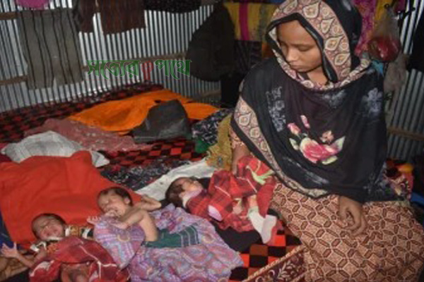 সরেজমিনে ওই বাড়িতে গেলে দেখা যায়, ছোট ঘরের এক কোণে পুরোনো খাটে পাশাপাশি শুয়ে আছে ৩টি নবজাতক। পাশে বসা রোগা ও শীর্ণদেহের মা রিতু মনি তাদের দিকে তাকিয়ে চোখ মুছছেন বারবার।