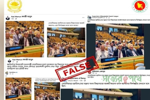 সামাজিক যোগাযোগমাধ্যমে প্রচারিত একটি ছবিতে দাবি করা হচ্ছে, জাতিসংঘ সাধারণ পরিষদের অধিবেশনে ইসরাইলের প্রধানমন্ত্রী বেনিয়ামিন নেতানিয়াহুর বক্তব্য চলাকালে বাংলাদেশের প্রধান উপদেষ্টা অধ্যাপক ড. মুহাম্মদ ইউনূস ও তার সফরসঙ্গী রাজনৈতিক নেতারা সভাকক্ষে বসে ছিলেন। তবে এই দাবি সম্পূর্ণ ভুয়া ও বিভ্রান্তিকর বলেই জানিয়েছে প্রধান উপদেষ্টার প্রেস উইং ফ্যাক্টস। শনিবার সামাজিক যোগাযোগমাধ্যম ফেসবুকে দেওয়া এক পোস্টে এ