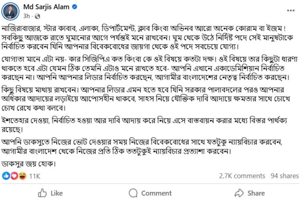 ফেসবুক পোস্টে সারজিস লিখেন, ‘নাজিরাবাজার, স্টার কাবাব, এলাকা, ডিপার্টমেন্ট, ক্লাব কিংবা অভিনব আরও অনেক কোরাম বা ইজম! সবকিছু আজকে রাতে ঘুমানোর আগে পর্যন্তই মনে রাখবেন। ঘুম থেকে উঠে নির্দিষ্ট পদে সেই মানুষটাকে নির্বাচিত করবেন যিনি আপনার বিবেকবোধের জায়গা থেকে ওই পদে সবচেয়ে যোগ্য।’